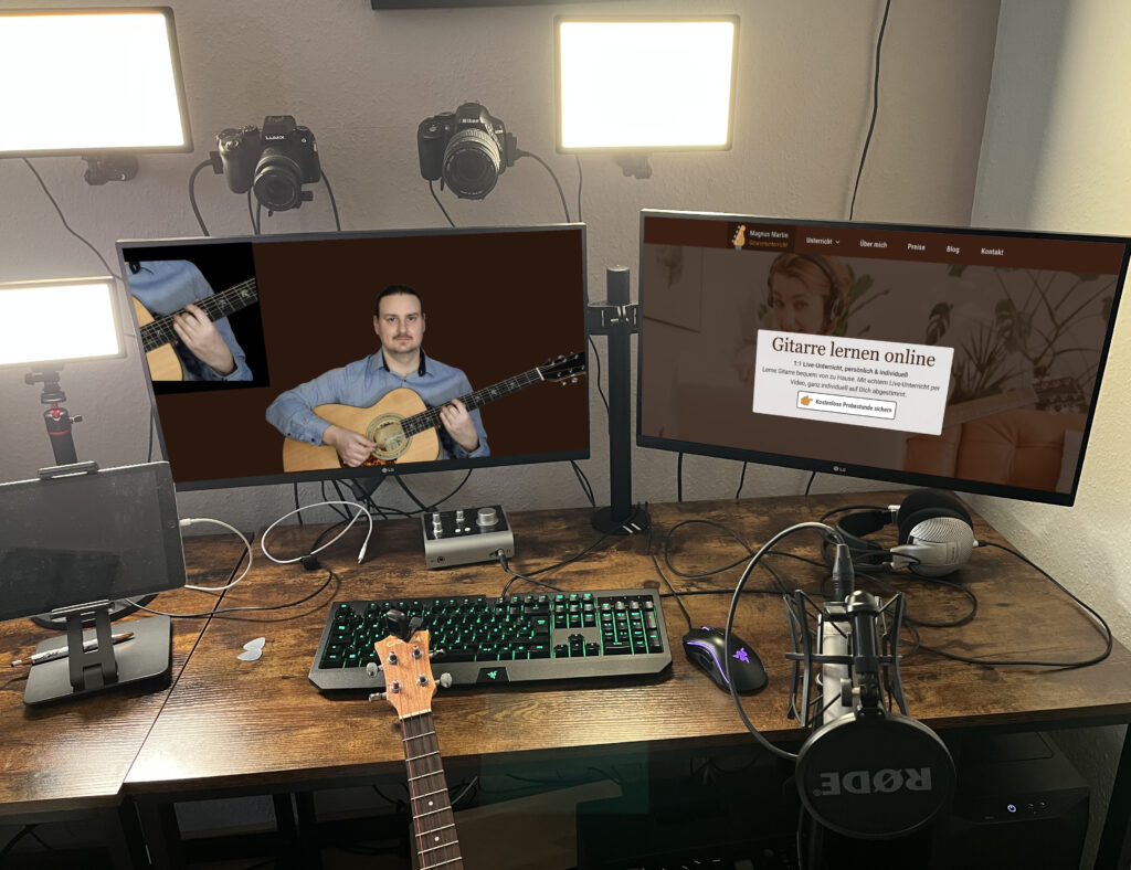 Mit meinem professionellen Setup, bestehend aus zwei Kameras, einem hochwertigen Mikrofon und optimaler Beleuchtung, bekommst Du ein Unterrichtserlebnis, das dem persönlichen Unterricht sehr nahekommt.