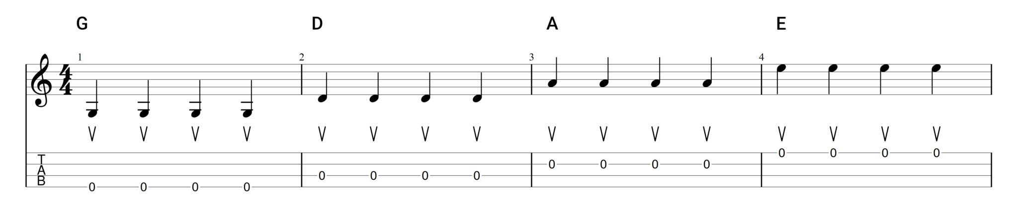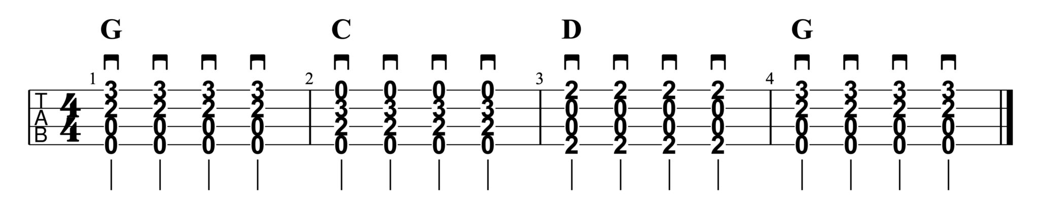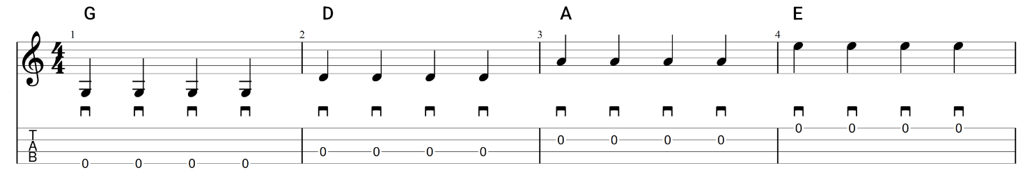 - Greife den G-Akkord und spiele 4 langsame Schläge