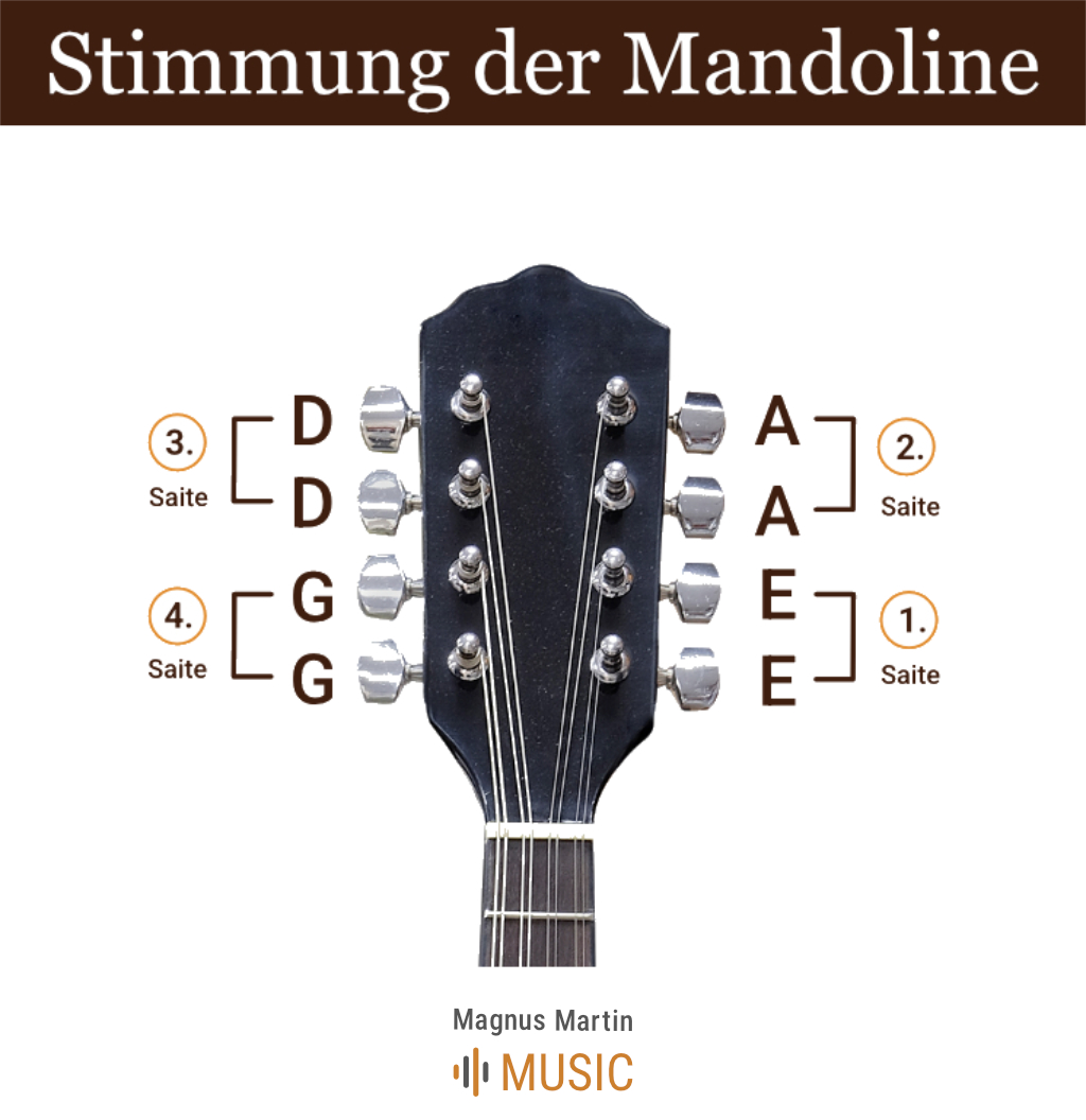 Die Mandoline hat 8 Saiten in 4 Doppel-Saiten (G, D, A, E).