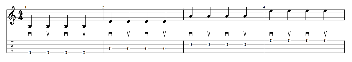 Bevor wir Akkorde einbauen, solltest Du die Abschlag- und Aufschlagbewegung auf den vier einzelnen Saitenpaaren üben.